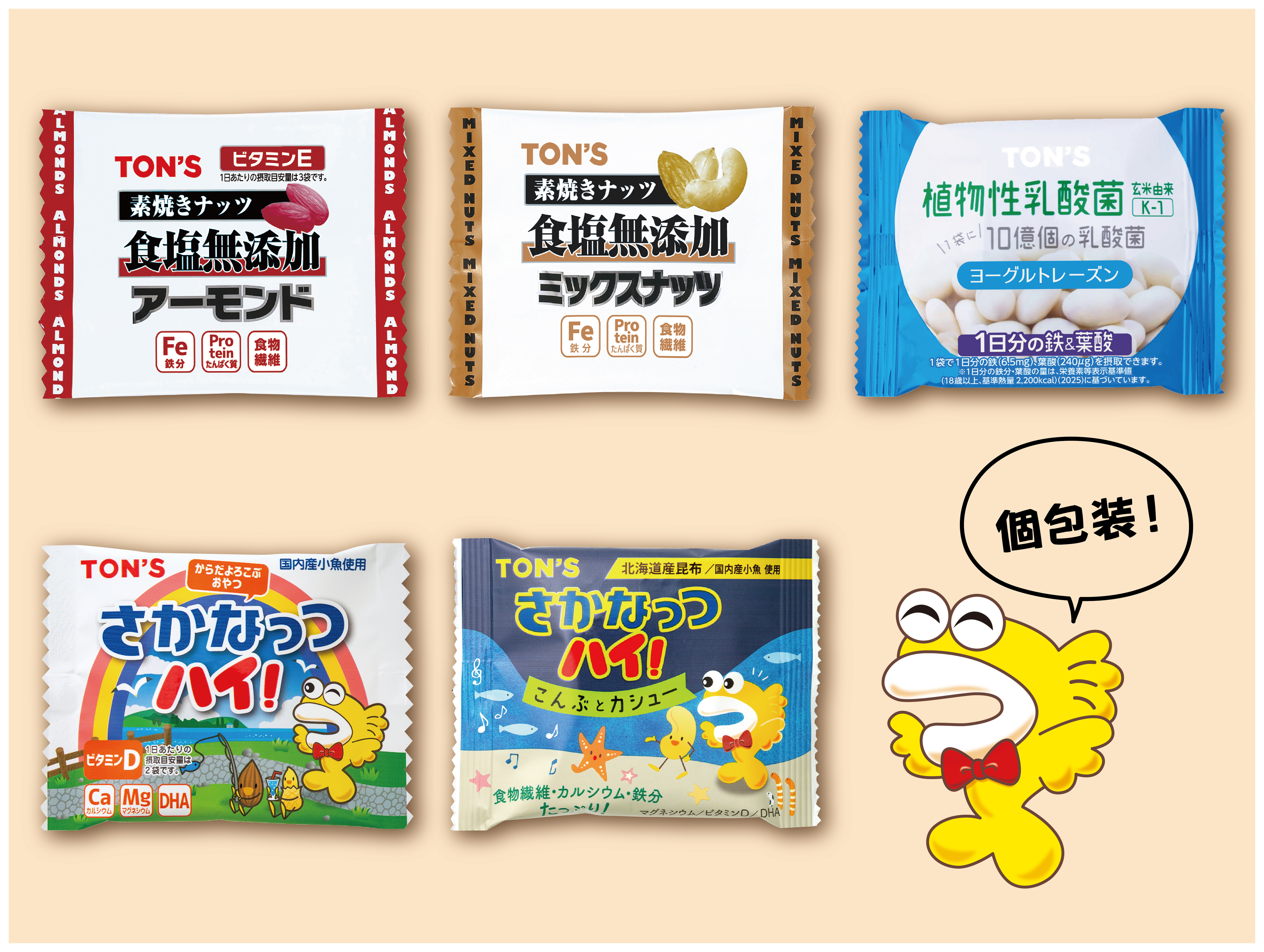 7種類のナッツが1袋に!『ナナナッツ』 TON'S Snacky 口の中マジでパラダイス! 「焦がしキャラメルナッツ」人気シリーズ誕生の裏側 温活くるみ 特設サイト 新着記事 栄養士だより | 2026.04.24 食べ過ぎ防止におすすめ!食べきりサイズのナッツドライフルーツ アーモンドフェスティバル | 2026.03.16 第36回 アーモンドフェスティバルのお知らせ【2026年】 ナッツ雑学 | 2026.03.13 ナッツ×みそ、相性いいかも! ポーションシリーズ | 2026.01.14 ロングセラー商品『さかなっつハイ!』祝40年イベントまとめ ナッツ雑学 | 2025.12.09 「ウェルネスフードアワード2025」金賞を受賞しました! 記事一覧をみる おすすめ記事 ヘーゼルナッツの話 ヘーゼルナッツとは?世界三大ナッツと呼ばれるナッツをご紹介! その他の製品 7種類のナッツが1袋に!『ナナナッツ』 ナッツのこと 【保存版】こんな時にはこのナッツ!美容や体のお悩み別ナッツ6選 よく読まれている記事 6287 アーモンドフェスティバル そっくりな花「アーモンド」と「桜」の違いや簡単な見分け方とは 4388 栄養士だより ナッツって1日何粒まで食べていいの?正しいナッツの適正量を知りましょう 4052 アーモンドフェスティバル 第36回 アーモンドフェスティバルのお知らせ【2026年】 2976 クルミの話 クルミが身体にいい理由とは?クルミの栄養と1日の摂取目安量をご紹介します ナッツのこと ナッツは、その種類によって栄養も効果も様々。ナッツを知って、あなたのライフスタイルにぴったりのナッツを、賢く取り入れてみましょう。 1日23粒で体の中から アンチエイジング ビタミンB1と鉄分で、 疲れた身体をリフレッシュ! オメガ3脂肪酸、食物繊維が豊富で、 ヘルシーなダイエットに最適! カリウム豊富! お酒との相性バツグン! パルミトレイン酸で美肌美人! オレイン酸豊富! 体の中からアンチエイジング! 風邪の予防に効果的! 小腹が空いた時のおやつに! 1日1粒OK! 美肌成分セレンが豊富! 鉄分豊富! 貧血、抜け毛の予防に! もっと、色んなナッツについて知る @tons_cafe @tons_cafe