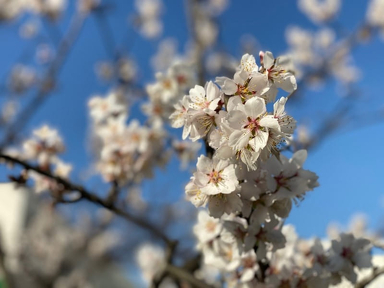 アーモンドは桜と同じバラ科のサクラ属の落葉高木のため、花を一目見ただけでは桜と区別がつかないほど似ています。アメリカ・カリフォルニア州では2月上旬~3月中旬ごろに開花します。弊社でもアーモンドの木を植栽しており、桜よりもちょっぴり早く咲くアーモンドの花は一足早い春を感じることができます。