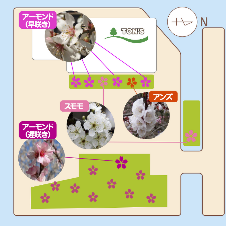 庭園ではアーモンドをはじめ、桜、スモモ、プルーン、かりん、ヘーゼル、アンズなど