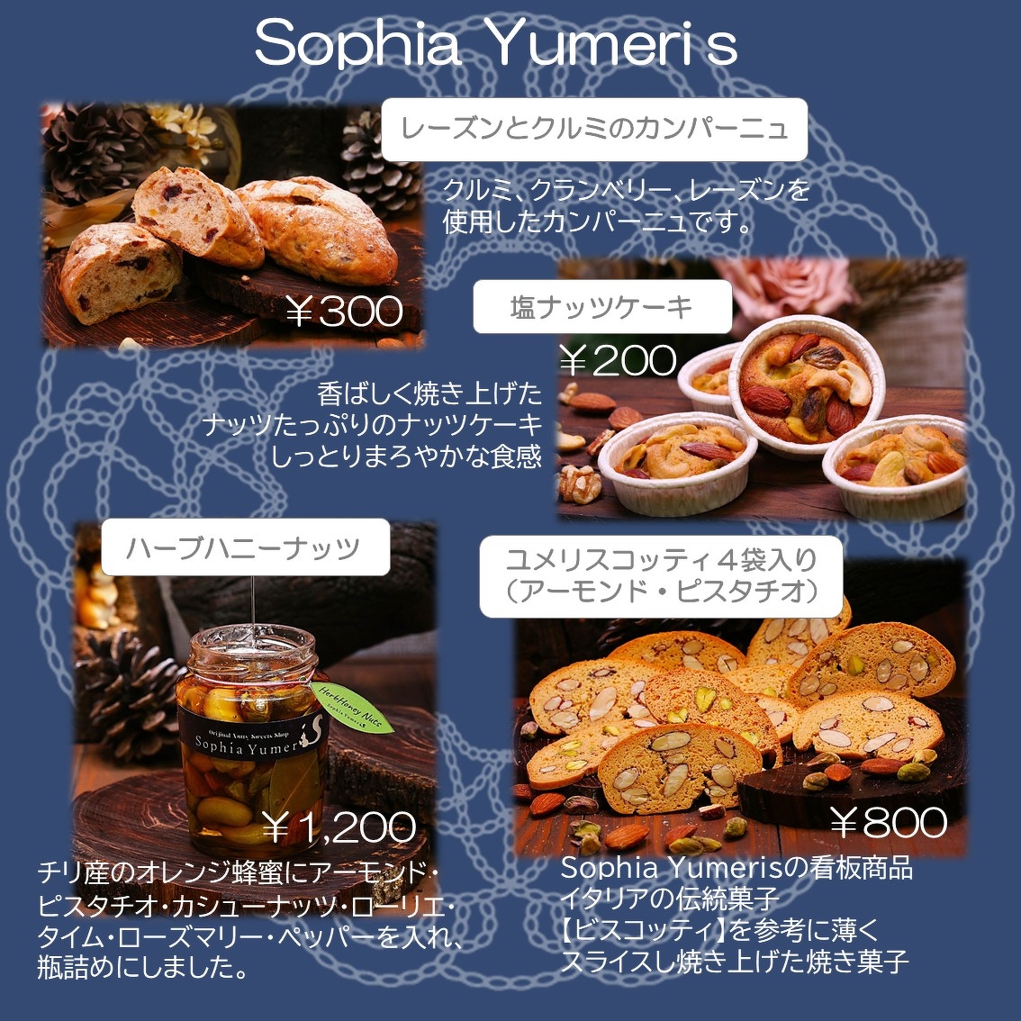 イタリアの伝統菓子【ビスコッティ】を参考に、ナッツを生地がまとまる限界量まで練りこみ、独自製法で可能な限り薄くスライスし、合計3度もの焼き工程で、軽い食感とナッツの風味を生かし、食べやすく仕上げたSophia Yumerisの看板商品です。