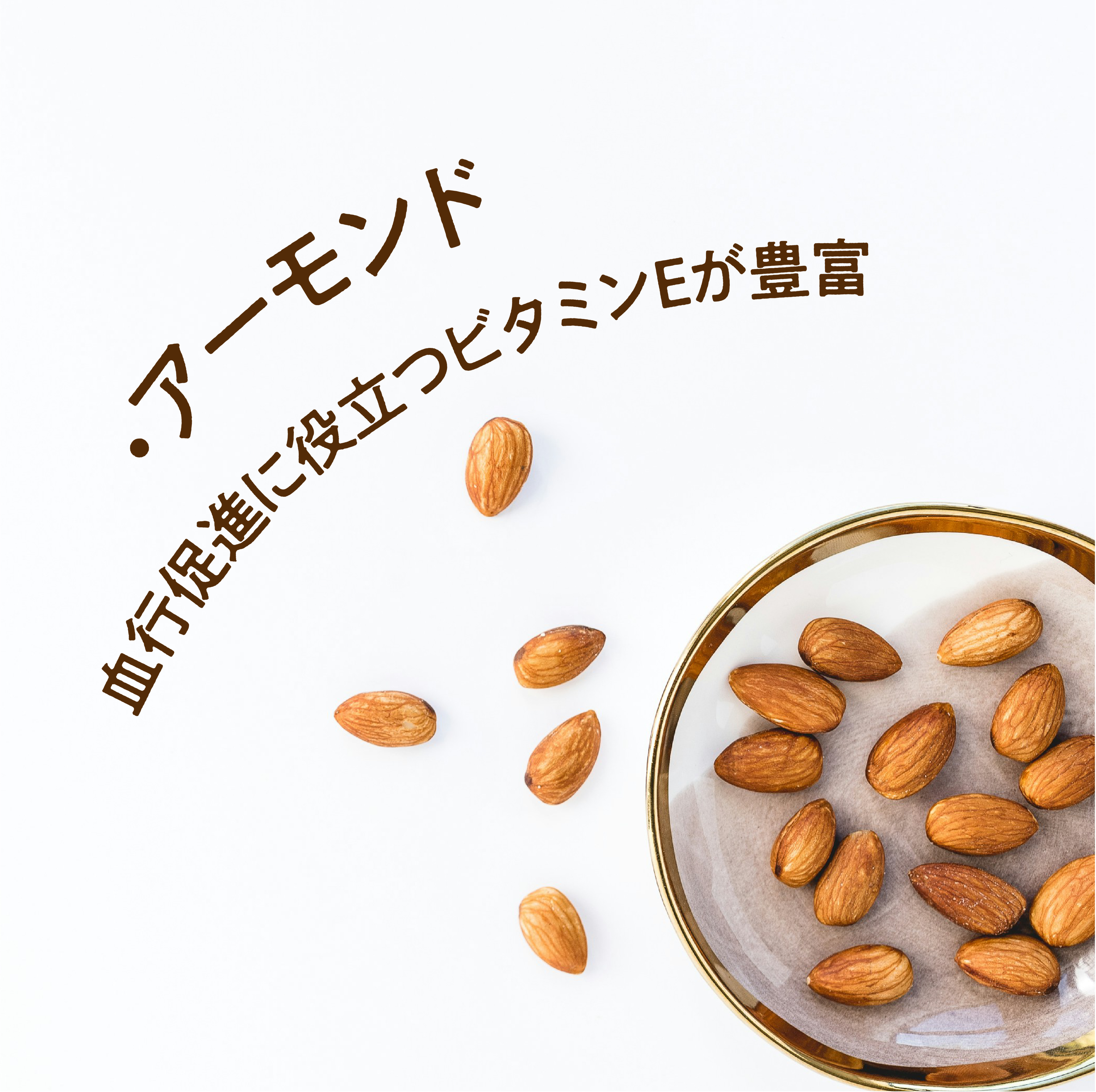 ナッツには、血行や筋肉の働きをサポートする栄養素が含まれています。