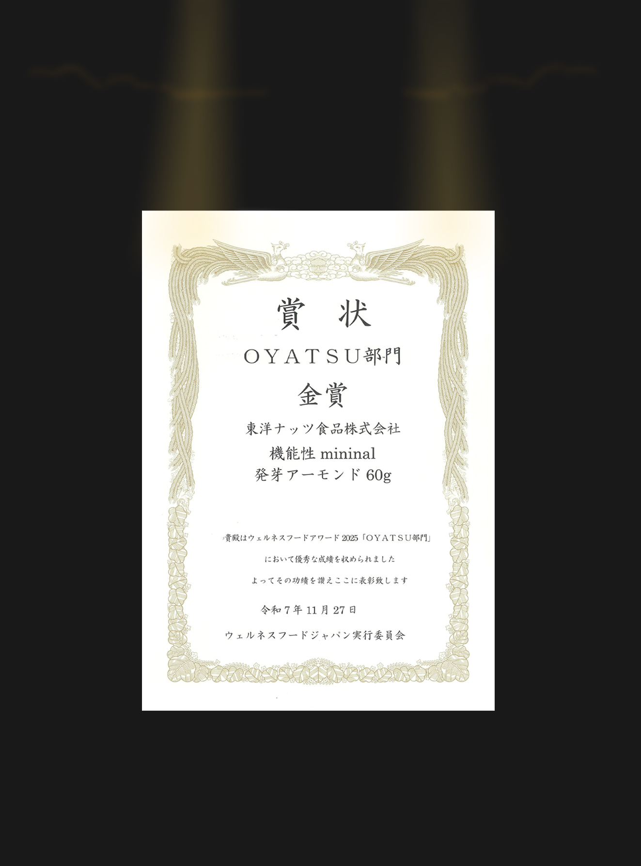 この度、当社の「機能性 mininal発芽アーモンド」が、第8回ウェルネスフードアワード2025 OYATSU部門にて「金賞」を受賞しました。