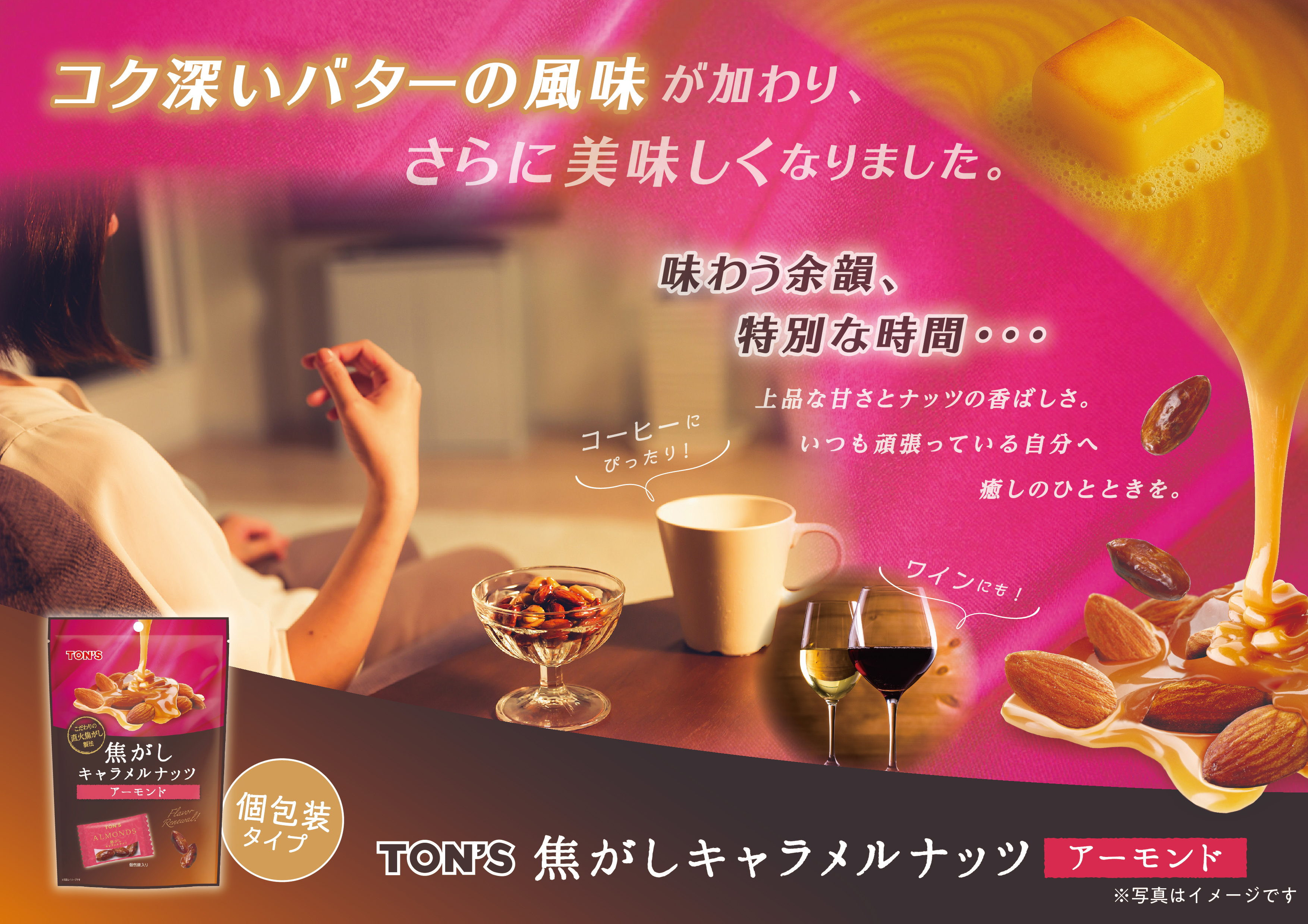 じっくり深煎りしたアーモンドを、直火焦がし製法でキャラメルコートしました。 際立つ香ばしさと上品な甘さ、隠し味はひとつまみの塩。コク深いバターの風味が加わり、さらにおいしくなりました。