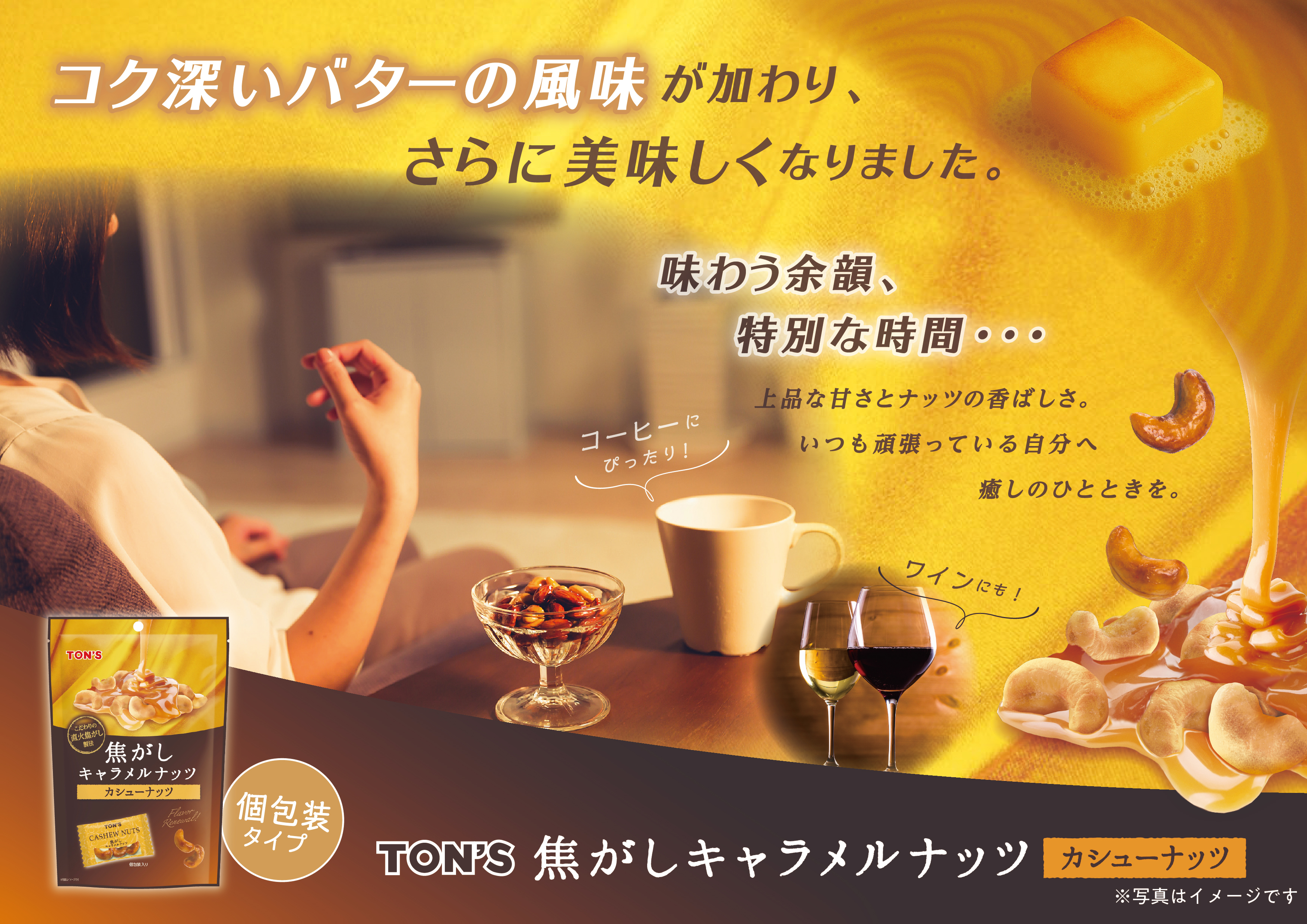 丁寧に焙煎したカシューナッツを、直火焦がし製法でキャラメルコートしました。 際立つ香ばしさと上品な甘さ、隠し味はひとつまみの塩。 コク深いバターの風味が加わり、さらにおいしくなりました。