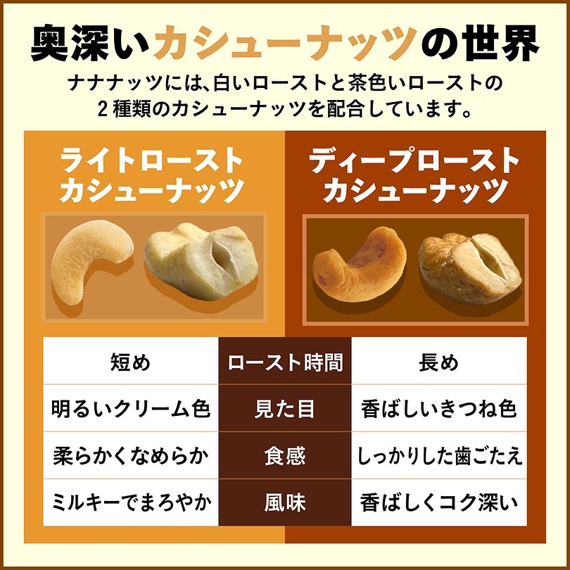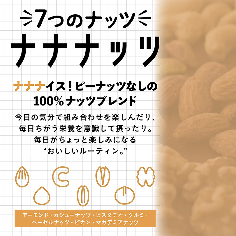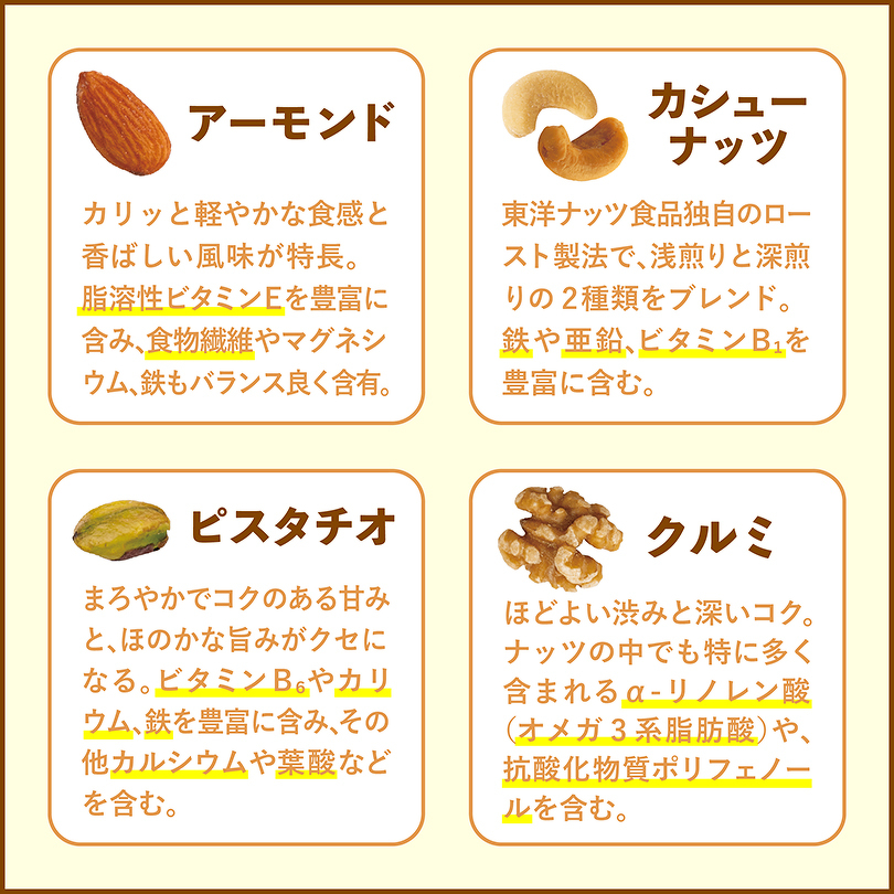 原料原産地 :アーモンド(アメリカ合衆国)、カシューナッツ(インド)、クルミ(アメリカ合衆国)、ピカンナッツ(アメリカ合衆国)、マカデミアナッツ(オーストラリア)、ヘーゼルナッツ(トルコ)、ピスタチオ (アメリカ合衆国)