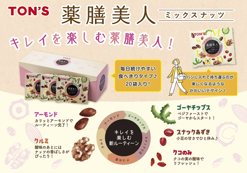 薬膳素材とナッツによる「キレイを楽しむ新ルーティーン」ミックスです。ゴーヤチップス、スナック小豆、クコの実、アーモンド、クルミの5種類をミックスし、20袋をセットにしています。