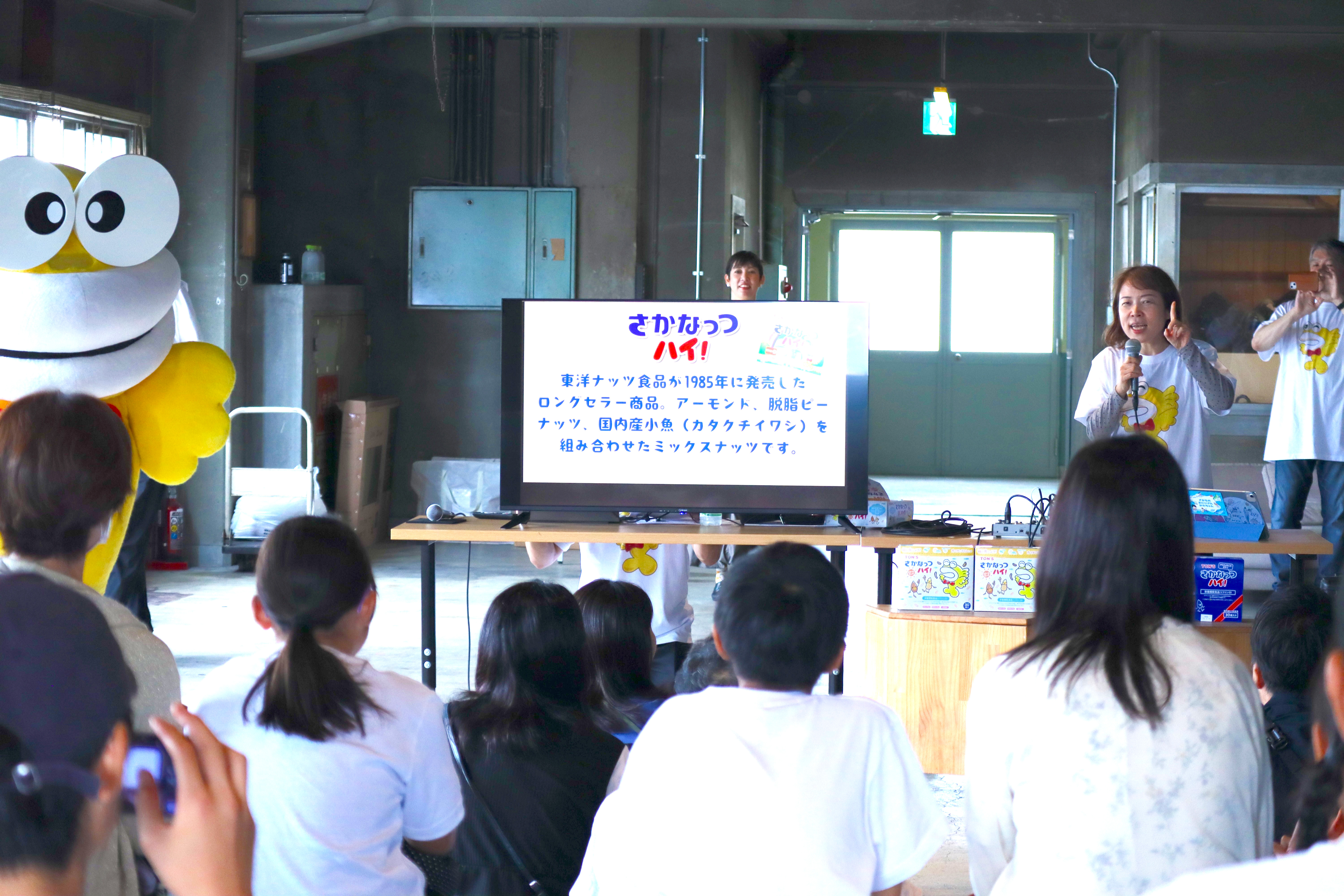 『さかなっつハイ!』は、アーモンドや脱脂ピーナッツに加えて、カルシウム豊富なカタクチイワシを組み合わせたおやつとして1985年に誕生。以来40年間、世代を超えて愛され続けてきました。『さかなっつハイ!』のイメージキャラクター「さかなっつくん」と一緒に登場した担当者は、「この商品は、子どもの勉強のお供