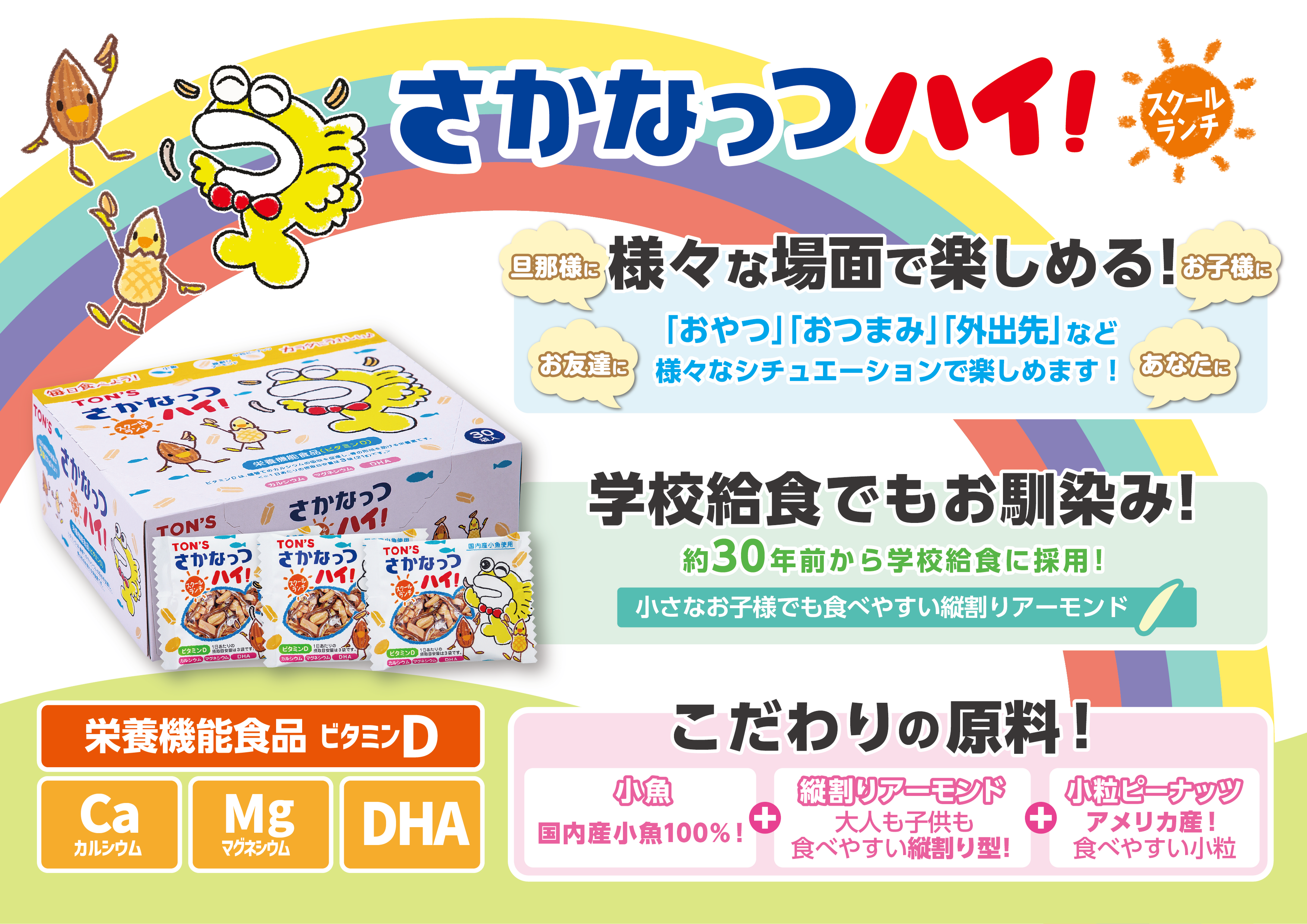 国内海産小魚、小粒のピーナッツ、縦にカットしたアーモンド。 お子様にも食べやすいミックスバランスで、学校給食でもおなじみのスクールランチさかなっつ。